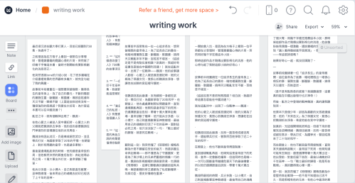 此時,只需逐一把 Notion 裡的筆記丟進來,一張張攤開。然後像在拼拼圖一樣,把不同筆記中有用的段落,拖拉到我想要的位置,再根據主題調整順序,很快就能拼出一篇完整的文章。
