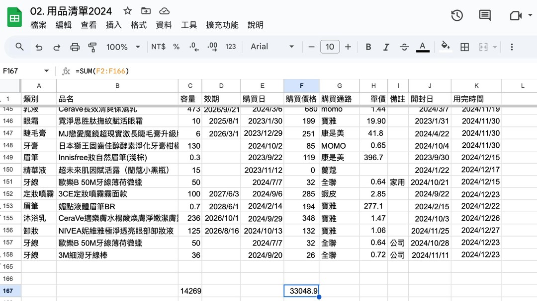 我做了一個財產清單,記錄所有購入的日用品以及保養化妝品。